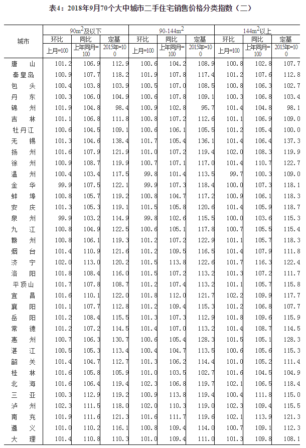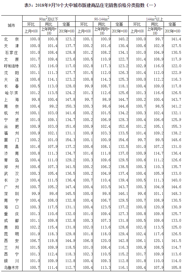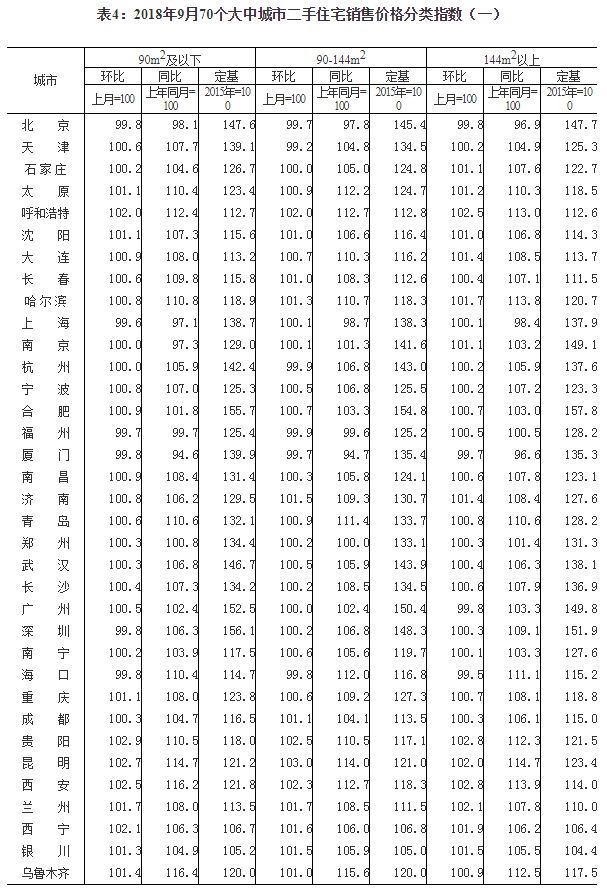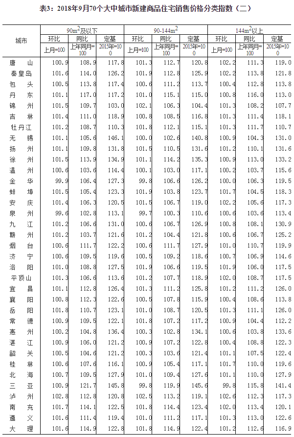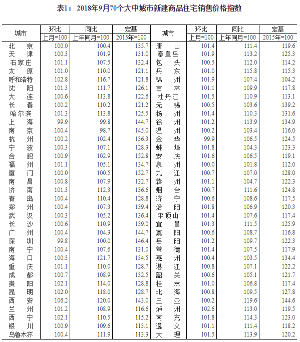 2018年9月份70個大中城市商品住宅銷售價格變動情況