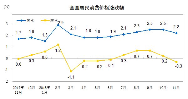 2018年11月份居民消費價格同比上漲2.2%