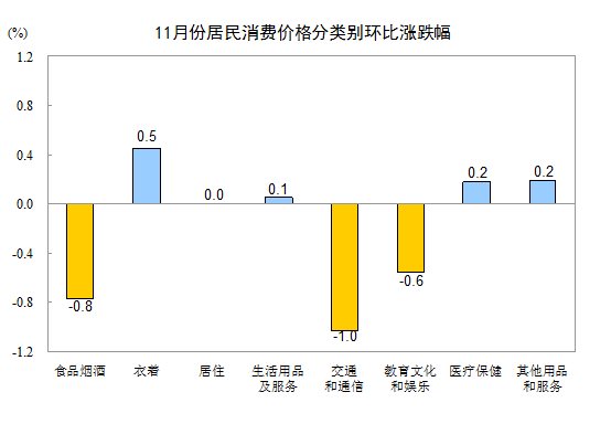 11月份,全國居民消費價格環(huán)比下降0.3%。其中,城市下降0.4%,農(nóng)村下降0.3%;食品價格下降1.2%,非食品價格下降0.1%;消費品價格下降0.5%,服務價格下降0.2%。