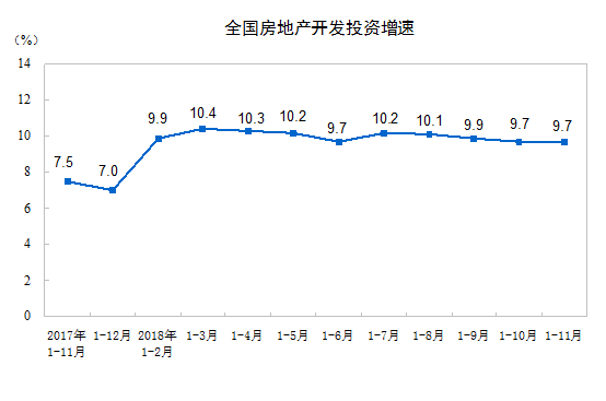 2018年1-11月份,全國房地產(chǎn)開發(fā)投資110083億元,同比增長9.7%,增速與1-10月份持平。其中,住宅投資78027億元,增長13.6%,增速回落0.1個百分點。住宅投資占房地產(chǎn)開發(fā)投資的比重為70.9%。