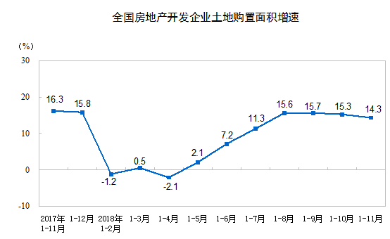 1-11月份,房地產(chǎn)開發(fā)企業(yè)土地購置面積25326萬平方米,同比增長14.3%,增速比1-10月份回落1個百分點;土地成交價款13746億元,增長20.2%,增速回落0.4個百分點。