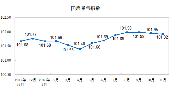 11月份,房地產(chǎn)開發(fā)景氣指數(shù)(簡稱“國房景氣指數(shù)”)為101.92,比10月份回落0.03點。