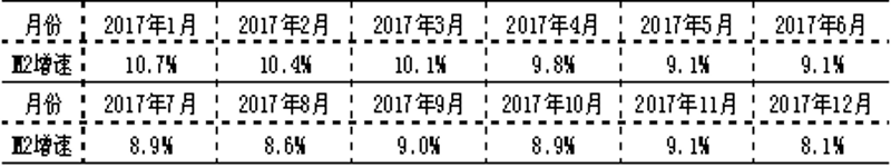 注2:2018年1月,人民銀行完善貨幣供應量中貨幣市場基金部分的統(tǒng)計方法,用非存款機構部門持有的貨幣市場基金取代貨幣市場基金存款(含存單)。完善后,2017年各月末M2增速如下: