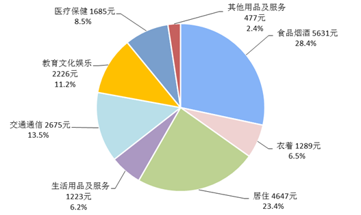 全年全國(guó)居民人均食品煙酒消費(fèi)支出5631元,比上年增長(zhǎng)4.8%,占人均消費(fèi)支出的比重為28.4%;人均衣著消費(fèi)支出1289元,增長(zhǎng)4.1%,占人均消費(fèi)支出的比重為6.5%;人均居住消費(fèi)支出4647元,增長(zhǎng)13.1%,占人均消費(fèi)支出的比重為23.4%;人均生活用品及服務(wù)消費(fèi)支出1223元,增長(zhǎng)9.1%,占人均消費(fèi)支出的比重為6.2%;人均交通通信消費(fèi)支出2675元,增長(zhǎng)7.1%,占人均消費(fèi)支出的比重為13.5%;人均教育文化娛樂(lè)消費(fèi)支出2226元,增長(zhǎng)6.7%,占人均消費(fèi)支出的比重為11.2%;人均醫(yī)療保健消費(fèi)支出1685元,增長(zhǎng)16.1%,占人均消費(fèi)支出的比重為8.5%;人均其他用品及服務(wù)消費(fèi)支出477元,增長(zhǎng)6.8%,占人均消費(fèi)支出的比重為2.4%。