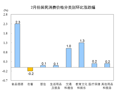 2月份,全國居民消費價格環(huán)比上漲1.0%。其中,城市上漲1.0%,農(nóng)村上漲0.9%;食品價格上漲3.2%,非食品價格上漲0.4%;消費品價格上漲1.2%,服務(wù)價格上漲0.7%。