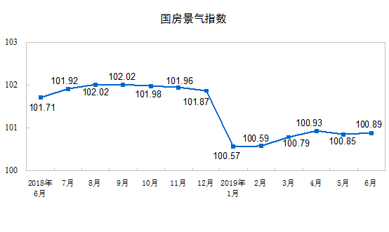 6月份,房地產(chǎn)開發(fā)景氣指數(shù)(簡稱“國房景氣指數(shù)”)為100.89,比5月份提高0.04點。
