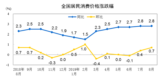 2019年8月份居民消費(fèi)價格同比上漲2.8%