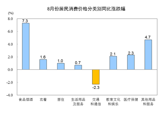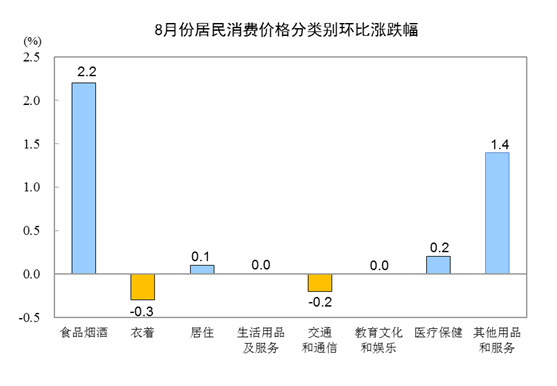 8月份,全國居民消費(fèi)價格環(huán)比上漲0.7%。其中,城市上漲0.6%,農(nóng)村上漲1.0%;食品價格上漲3.2%,非食品價格上漲0.1%;消費(fèi)品價格上漲1.1%,服務(wù)價格上漲0.2%。