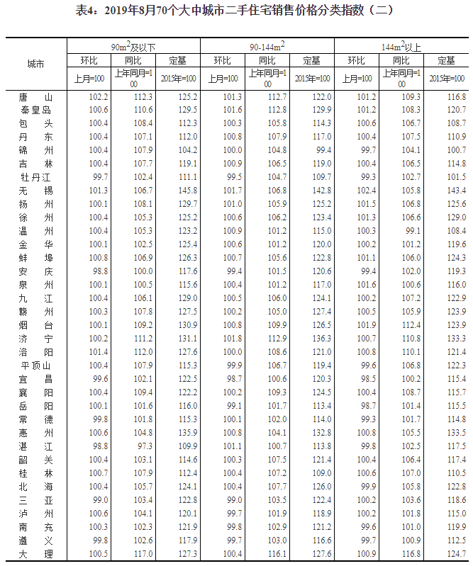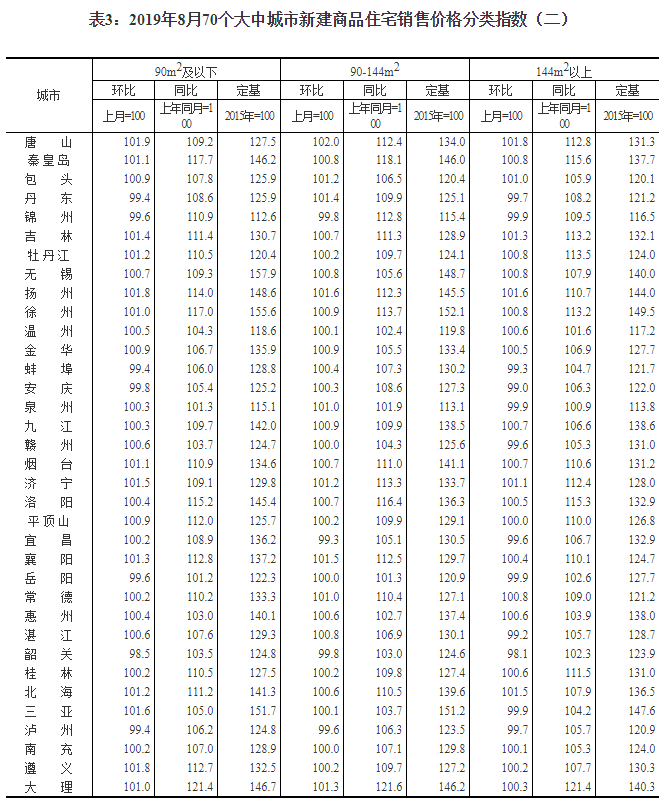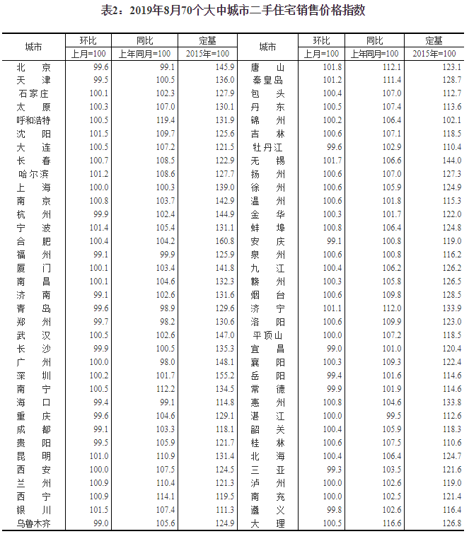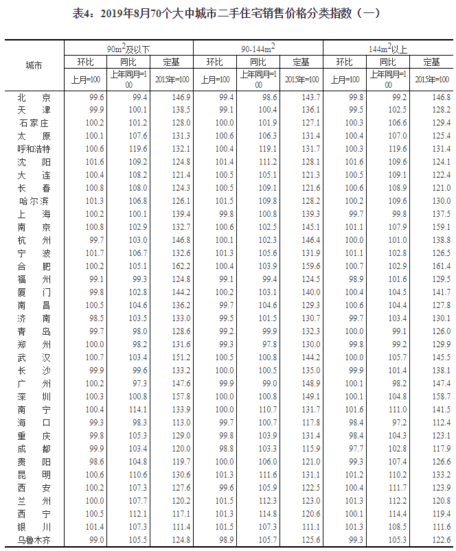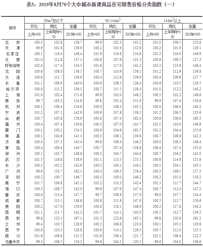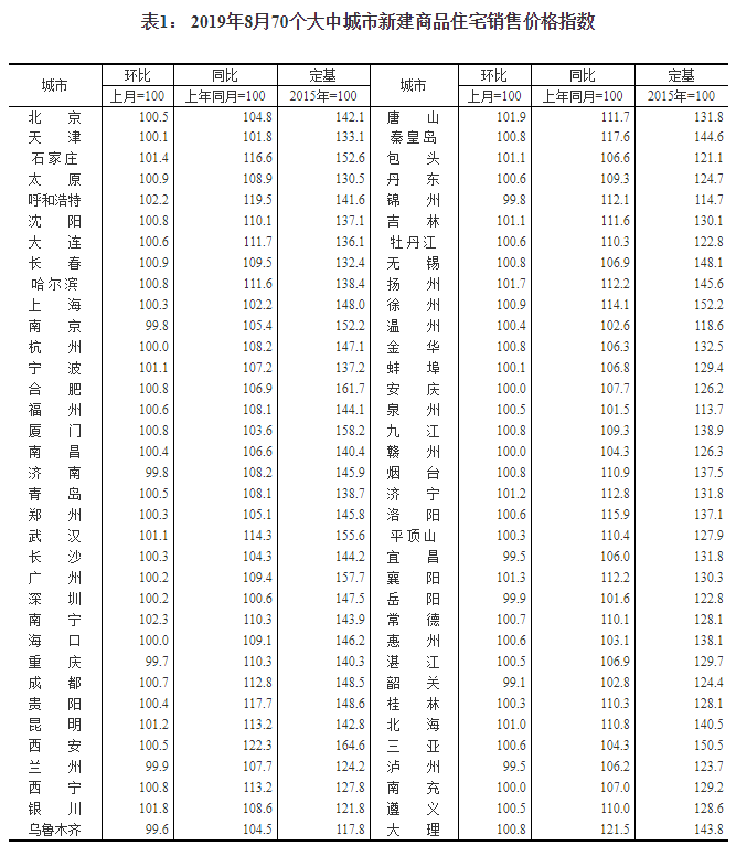 2019年8月份70個大中城市商品住宅銷售價格變動情況