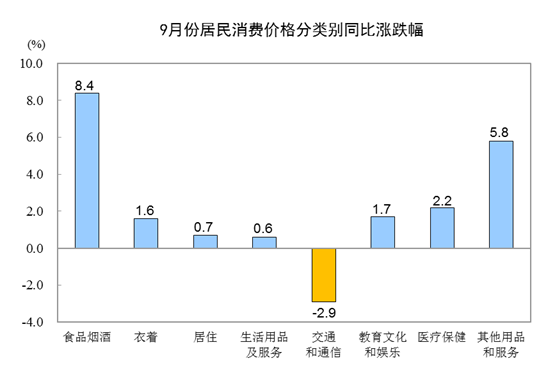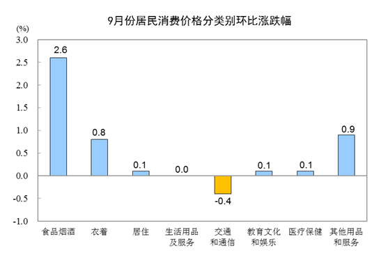 9月份,全國居民消費價格環(huán)比上漲0.9%。其中,城市上漲0.7%,農(nóng)村上漲1.3%;食品價格上漲3.5%,非食品價格上漲0.2%;消費品價格上漲1.5%,服務(wù)價格下降0.1%。