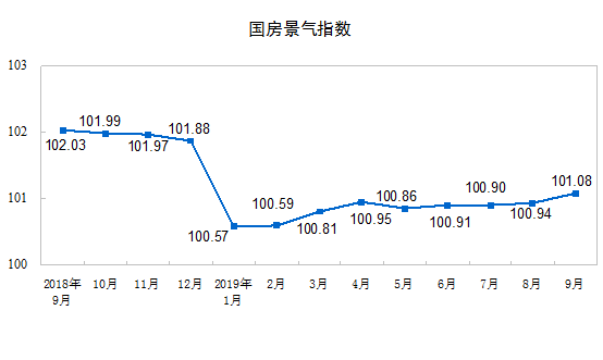9月份,房地產(chǎn)開發(fā)景氣指數(shù)(簡稱“國房景氣指數(shù)”)為101.08,比8月份提高0.14點。