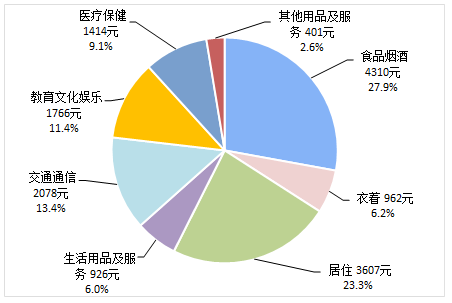 前三季度,全國居民人均食品煙酒消費(fèi)支出4310元,增長6.1%,占人均消費(fèi)支出的比重為27.9%;人均衣著消費(fèi)支出962元,增長3.8%,占人均消費(fèi)支出的比重為6.2%;人均居住消費(fèi)支出3607元,增長10.3%,占人均消費(fèi)支出的比重為23.3%;人均生活用品及服務(wù)消費(fèi)支出926元,增長3.2%,占人均消費(fèi)支出的比重為6.0%;人均交通通信消費(fèi)支出2078元,增長7.6%,占人均消費(fèi)支出的比重為13.4%;人均教育文化娛樂消費(fèi)支出1766元,增長13.5%,占人均消費(fèi)支出的比重為11.4%;人均醫(yī)療保健消費(fèi)支出1414元,增長10.9%,占人均消費(fèi)支出的比重為9.1%;人均其他用品及服務(wù)消費(fèi)支出401元,增長11.1%,占人均消費(fèi)支出的比重為2.6%。
