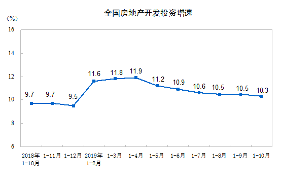 2019年1—10月份,全國房地產開發(fā)投資109603億元,同比增長10.3%,增速比1—9月份回落0.2個百分點。其中,住宅投資80666億元,增長14.6%,增速回落0.3個百分點。