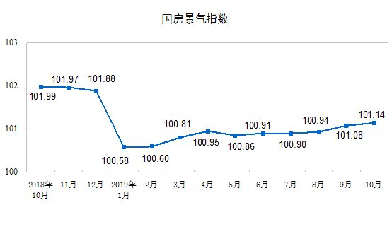 10月份,房地產開發(fā)景氣指數(shù)(簡稱“國房景氣指數(shù)”)為101.14,比9月份提高0.06點。